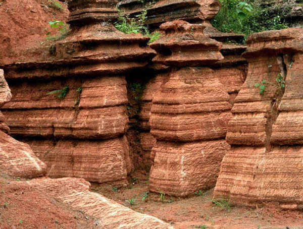 這些石柱不但顏色各異,而且大小不等。有的高達(dá)七、八米,而有些則像半埋于地下的巨獸骨架。一位村民告訴記者,現(xiàn)在石林沒(méi)有以前壯觀(guān),都長(zhǎng)渣子(灌木)了。原因是由于山頂樹(shù)木減少,雨水將泥土帶下山,很多石頭都被埋在土下,后來(lái)這些地方都開(kāi)墾了農(nóng)田,石林也被永久覆蓋。