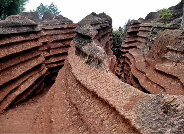 在路邊一棵樹(shù)下,一排直徑有30厘米粗、1米多高,排列得像牙齒一般細(xì)密的石柱躲在樹(shù)蔭下,似乎在躲著陽(yáng)光。幾個(gè)多小時(shí)的探尋過(guò)程中,“石林”總是讓人驚喜,爬行的劍龍、攀行的巨猿、雅致別趣的“蓮花寶座”和莊嚴(yán)的“佛手”,讓人流連忘返 ……當(dāng)?shù)卮迕裣蛴浾呓榻B道,這只是整個(gè)“石林”的一部分,最大的一片石林大約方圓600畝左右,大部分是紅褐色。前幾年有人帶著專(zhuān)家來(lái)考察,說(shuō)這片石林已經(jīng)沉睡了4億年,是揚(yáng)子古海海底沉積的混合泥砂的碳酸鹽物質(zhì)形成的巖石,再經(jīng)地殼運(yùn)動(dòng)和侵蝕、溶蝕作用,就形成今天的奇觀(guān)。但卻由于投入資金量及交通等方面的考量,遲遲沒(méi)有人投資。