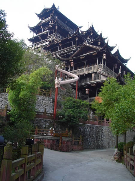 九重天世襲堂是土家風(fēng)情園的精華和靈魂所在。該建筑由土家民間藝人李宏進設(shè)計,依80度陡坡而建,高48米,共9重12層,整個樓房全部用木栓連接,沒有一顆鐵釘,堪稱土家族建筑史上的奇跡。2002年9 月22日,九重天吊腳樓被載入世界吉尼斯世界紀(jì)錄,認(rèn)定其為目前中國最大、最高、最完美的木質(zhì)結(jié)構(gòu)吊腳樓。2001年4月6日,朱镕基總理視察土家風(fēng)情園時,對九重天贊不絕口:“一批民間匠人能造出這樣輝煌的吊腳樓,而且還解決了力學(xué)的問題,真是不簡單!鼻迦A大學(xué)著名建筑學(xué)家何重義先生說:“張家界土家風(fēng)情園完全可以和蘇州的園林相媲美。特別是九重天世襲堂,猶如玉宇瓊閣,令人神往!”古人說,天有九野,地有九州,土有九山,山有九寨。古人又把九重叫做天,說天有九重,最上一重是上帝和君主居住的地方,所以我們叫它“九重天”。