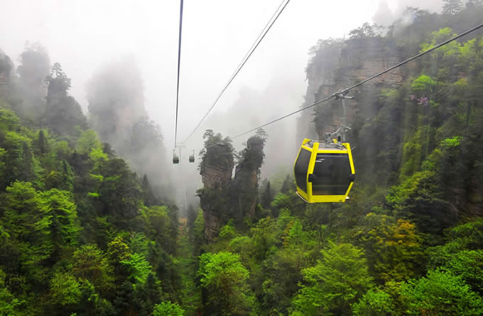 楊家界風(fēng)光 楊家界索道是世界自然遺產(chǎn)武陵源風(fēng)景名勝區(qū)繼天子山索道、黃石寨索道后的第三條客運(yùn)索道,上站位于八里坡游覽線劉家檐,下站位于中湖鄉(xiāng)野溪鋪村。該索道采用法國,斔鞯涝O(shè)備,是世界頂級雙回路循環(huán)式配置八人車廂式索道,全長1876米,上下站垂直高差517米,線路支架14個,最高運(yùn)行速度6m/s,最大運(yùn)力為2300人/小時,單程運(yùn)行時間5.2分鐘,是目前國際最先進(jìn)的客運(yùn)索道。