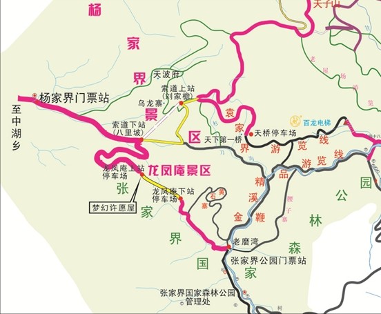 龍泉瀑布-楊家界風(fēng)光 3、中湖門票站進(jìn) 中湖門票站——索道下站八里坡停車場:(乘車)15分鐘 楊家界索道運(yùn)行時間5分鐘 索道上站——劉家檐停車場:(步行)5分鐘 劉家檐停車場——袁家界天橋停車場(乘車)10分鐘 劉家檐停車場——天子山停車場(乘車)25分鐘