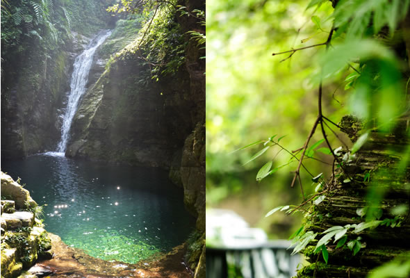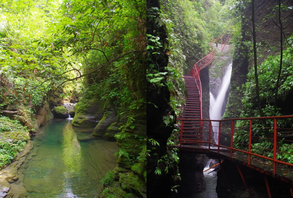十八潭總名。稍作休憩,我們開始奔赴東線的景點。東線主要是以十八潭為主,下游有4潭:合潭、梳妝潭、魚潭、黑潭;中游有9潭:換衣潭、美人潭、石蛙潭、姊妹潭(3個)、情侶潭(2個)、二龍搶珠,上游有5潭:鬼谷神功(2個)、幽潭、落銀潭(彩虹潭)、路邊潭。十八個潭深淺不一,淺則1米以上,深則4米左右,形狀各異,有的月牙形,有的豬腰狀,形狀不規(guī)則,石壁上水沖成潭,真是鬼谷神功,此處水質細膩,加之綠林映襯,水色碧綠見底,猶如十八顆翡翠石鑲嵌在山林之間,涓涓溪流晶瑩剔透,飛流直下的瀑布,氣勢磅礴,蔚為壯觀, 下游的4潭,合潭、梳妝潭、魚潭、黑潭。合潭是仙女峽谷與十八潭的交匯處;梳妝潭的水清如明鏡,又因為潭兩側石頭的封閉,使這面鏡子靜止不動,很方便梳妝,照鏡子。在梳妝潭周圍,有一種植物屬于紅豆杉系列,它的形狀好似梳子,可以用來梳頭。魚潭可不能望文生義。魚潭,是在冬天的時候,所有的魚都聚集在這里過冬,除此之外,這個潭水淺見底,冬天魚苗聚集,是捕魚的好季節(jié)。黑潭,水深不見底,所以叫黑潭,F(xiàn)在已經看不見梳妝潭、魚潭、黑潭了,你猜為什么?建水庫,建水上樂園,淹沒了。 斷魂石的傳說。三國時期,高氏和蕭氏一對夫妻春節(jié)忙活,遇上了天門垮眼,受余震襲擊,打死了丈夫蕭氏。高氏思念丈夫,淚哭不斷,結果摔死潭中。人們經常還能聽到哭聲傳來,不敢單獨行走,需成群結隊。后人為了鎮(zhèn)邪,雕刻一條蜈蚣驅趕哭魂,多年后,蜈蚣成精,天上打雷,巖石發(fā)光,遭雷所劈,成了斷魂石。 和尚姥,也就是丹灶峰,天門十六峰之一。相傳此峰為仙人化身,赤松子曾在此煉丹,許多詩人在此留下了美妙的詩篇,明代葉守禮《丹灶峰》: 懸崖峭壁隔塵寰,上有仙人學煉丹。 煉得丹成鶴已去,獨留丹灶在峰巒。 意思是說,在這險峻秀麗的山峰上,赤松子潛心煉丹,不受塵世干擾,身心沉醉于秀美的山間,沉溺于丹藥的煉制之中。作者很是羨慕那種與世隔絕的超脫,那種執(zhí)著于自我理想的瀟灑,你羨慕不羨慕? 竹林叢生。我們要學習竹子的精神,中空、謙卑;我們要學習竹子的精神,抱團生長;我們要學習竹子的精神,破土而出,節(jié)節(jié)高。 向家塔。打造農耕養(yǎng)生游的地方。種田、種菜、種花,農家餐館。 爛泥巴根。爛泥巴根和馬桑樹是同科,是這里獨特的一種樹。馬桑樹亦稱“千年紅”、“馬鞍子”,屬落葉灌木,馬桑樹多枝叢生,一簇一簇的,枝葉像傘蓋,因此“馬桑樹兒搭燈臺”。春風一吹,滿山的馬桑樹、爛泥巴根就吐翠滴綠,顯示出強勁的生命力。打油詩一首: 青青枝條四方走, 肥肥大葉落上頭, 身在路邊無人問, 冬去春來樂悠悠。 秋天死亡,春天長勢更加茂盛,它的新生是通過死亡實現(xiàn)的。山川如此,植物也是如此,這里的一草一木無不透露著道家那種齊生死、等貴賤的精神。 這叫“常道”亭,“道可道,非常道”,據(jù)說是白狐與劉海相遇的地方。吊橋。 十八潭各具特色。 中游有9潭。第五潭叫換衣潭。巖石聳立,霧氣氤氳,巖壁上布滿水汽,猶如雨下。又因過道狹窄,行人需彎腰通過,未免雨水打濕衣裳,在此就要脫下身上衣物,通過后在第六潭再穿上。因此第六潭又叫美人潭,很幽深神秘的。第七潭叫石蛙潭,水淺,又比較平穩(wěn)、安全,春天產籽。余音回響,猶如蛙鳴,給人“聽取蛙聲一片”的錯覺。 對面巖壁叫“臘肉鋪”,那條自上而下的溪流叫“酒長流”,客人來了,咱土家人熱情,臘肉下炕,苞谷燒,喝兩口! 第八潭第九潭叫情侶潭,比較隱蔽,他倆靜悄悄地談著情話,我們快走,不要打攪他們。 第十潭、十一潭、十二潭叫姊妹潭。下面那個,水淺淺的,溫溫的,是幺妹潭,中間那個是二哥潭,上面那個是大哥潭。 潭的旁邊有珍稀植物馬蘭花,馬蘭花又名蝴蝶花、蝴蝶蘭,為多年生宿根草本花卉,根莖短粗,肥壯;ù笮缕妫ㄉk麗,鮮艷奪目;ㄓ兴{、白、黃、雪青等色。花期5-6個月,每次花可開花7-10天,頗耐觀賞。馬蘭花在我國栽培已有2000多年的歷史,目前歐、亞、非3洲均有分布,品種極多,難以計數(shù)。此花按植株高度不同可分3種類型:矮株型僅18-25厘米,中株型高25-70厘米,高株型可高達120厘米。馬蘭花喜陽光,適栽于背風向砂質土壤中。 馬蘭開花的童謠。他們三姊妹小時候情感深厚,常常一起跳皮筋。大家會跳嗎?會唱嗎? 小汽車,滴滴滴,馬蘭開花二十一, 二五六二五七,二八二九三十一, 三五六三五七,三八三九四十一, 四五六四五七,四八四九五十一, 五五六五五七,五八五九六十一 ! 還有紅豆杉,像梳頭的篦子,叫“篦子三尖杉”。還有蘭心草,中草藥,空中飄來蘭花的香氣,山谷中峭壁的蘭花,如芳芳人品善良高雅。蘭花如人品有宜人的香氣,蘭花有撩人的幽香,任何花卉的香氣都不能與蘭花比。這幽香時隱時現(xiàn),時濃時淡,時遠時近。飄蕩在老道灣山谷中,給人清新和愉快的感受。 蘇轍有詩:“谷深不見蘭生處,追逐微風偶得之”。 還有大葉榕、玉葉金花、秋海棠、臘蓮繡球、四字馬蘭、紅楓,秋天來臨,看!漫山紅遍,層林盡染。 聞道亭。孔子曰:朝聞道,夕死可以。意思是說,人生悟到“道”的真諦是多么重要,如果是早上知道的,哪怕晚上去死都是值得的。 第十三潭叫二龍搶珠。兩條瀑布傾瀉而下,在中間交匯,就像是二條龍爭搶寶珠一樣。結果,這寶珠被狐王拿到,狐王又送給白狐當定情物,哪知白狐遇見善良的劉海,于是,上演了一幕新